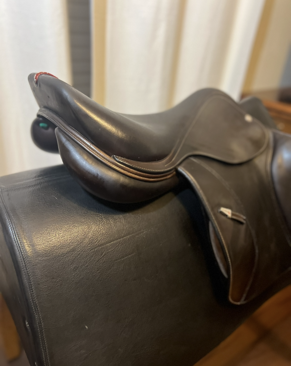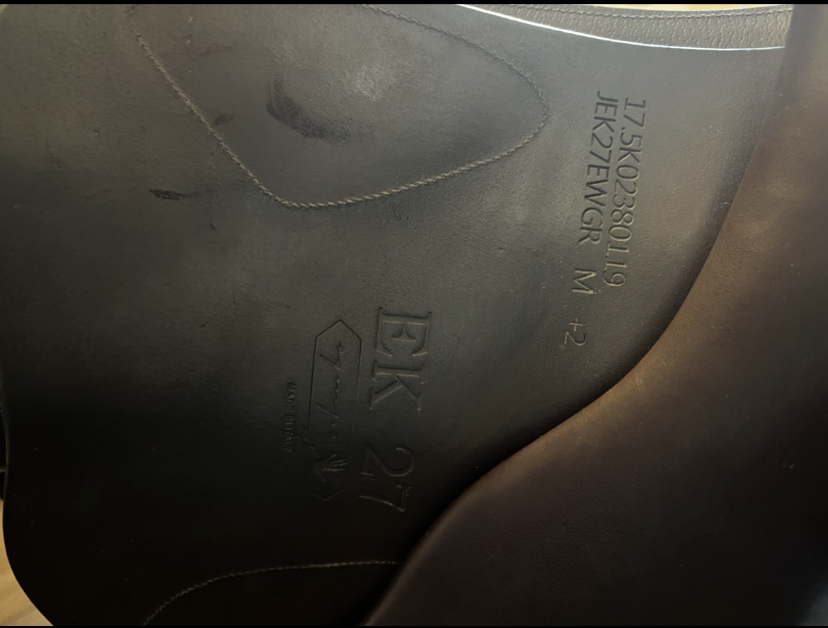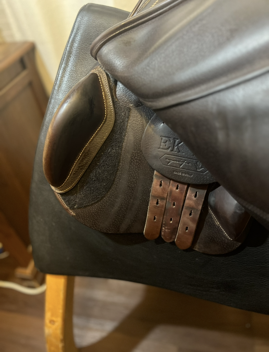 This saddle is in good condition, has movable velcro blocks, short, forward flaps, wider tree. (2019). New panels installed January- 26. Similar to our best seller EK26 but with slightly wider seat which gives the rider a more secure feel. Calfskin leather with grip leather on flap.