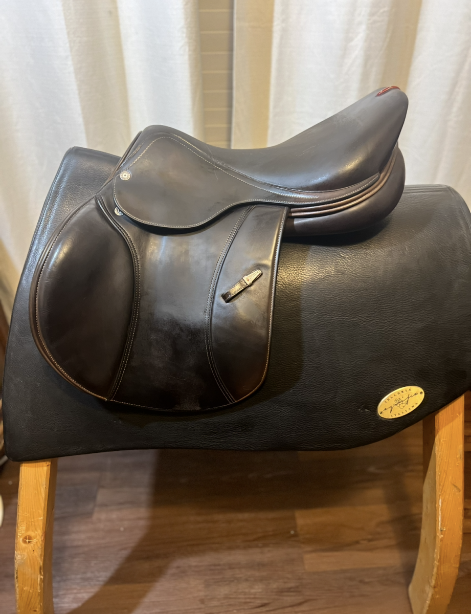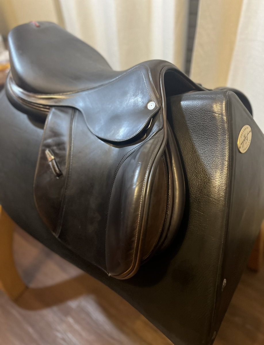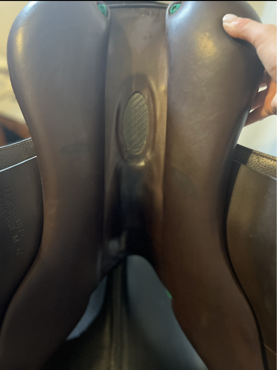 This saddle is in good condition, has movable velcro blocks, short, forward flaps, wider tree. (2019). New panels installed January- 26. Similar to our best seller EK26 but with slightly wider seat which gives the rider a more secure feel. Calfskin leather with grip leather on flap.