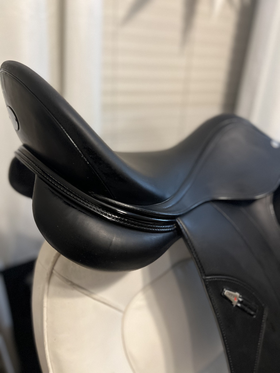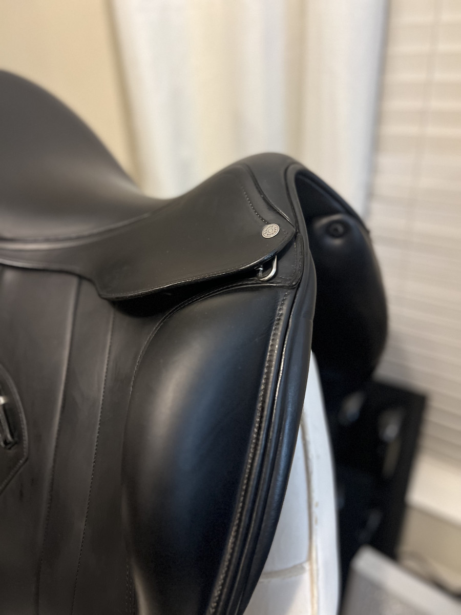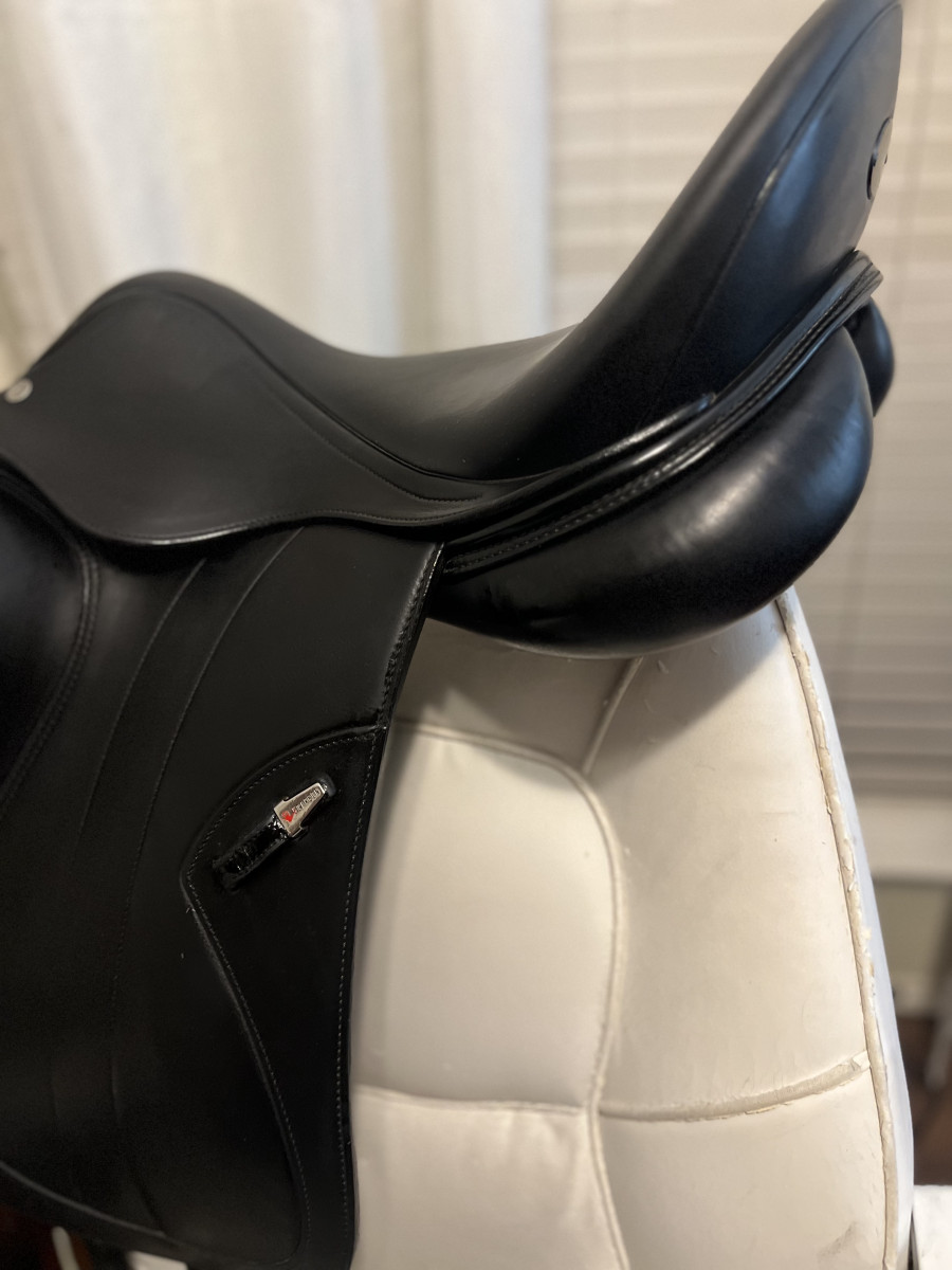 Kalifornia 17,5inch, black calfskin with patent black rear & stirrup keeper welting. Immaculate condition, M, +1.5, 2021. Carbon fiber tree. Saddle fitting possible in TX/OK by authorized Equipe fitter. Remote possible as well.