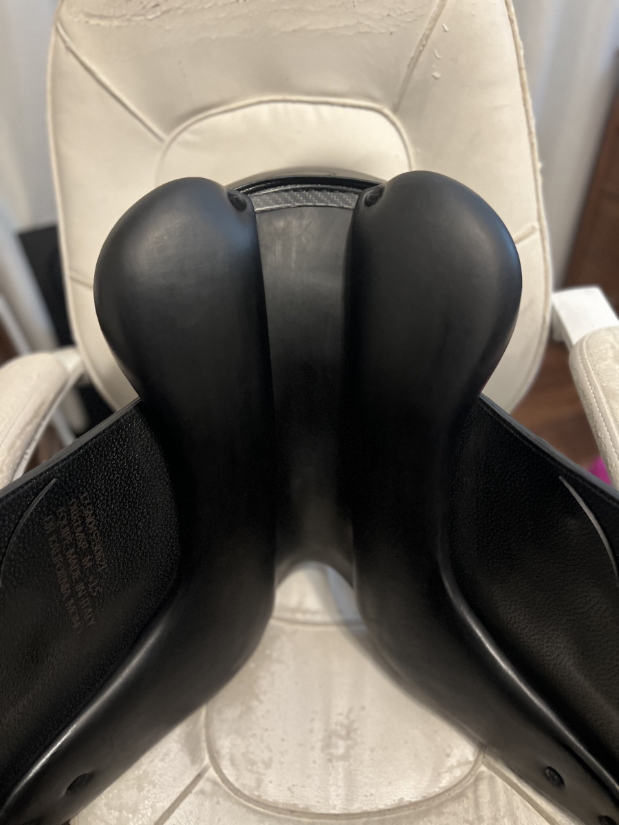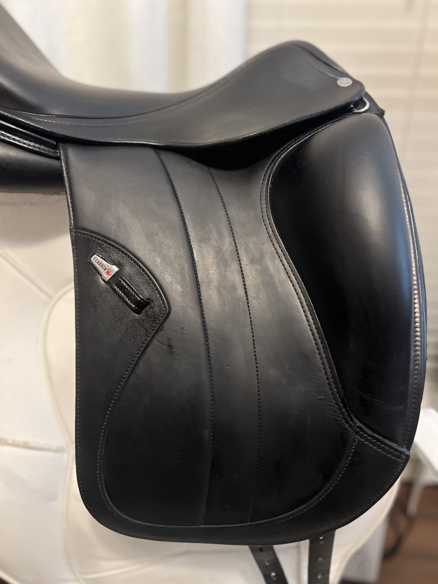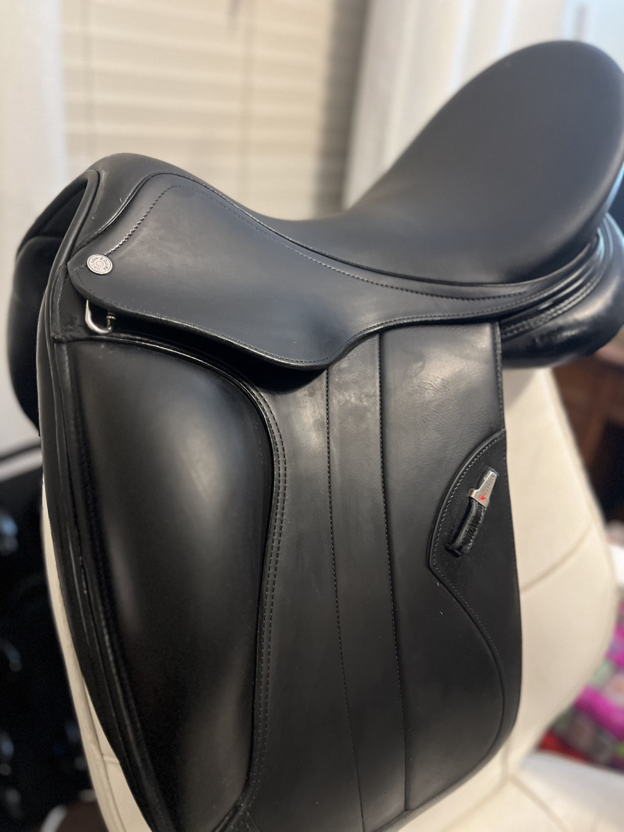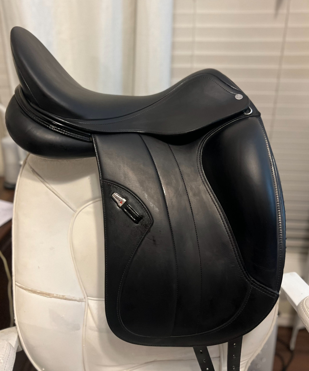 Kalifornia 17,5inch, black calfskin with patent black rear & stirrup keeper welting. Immaculate condition, M, +1.5, 2021. Carbon fiber tree. Saddle fitting possible in TX/OK by authorized Equipe fitter. Remote possible as well.