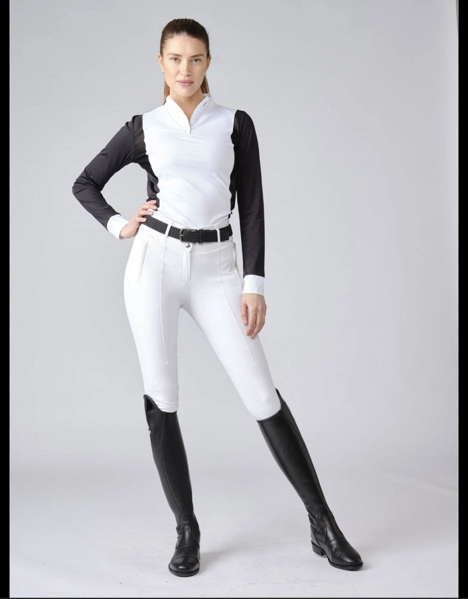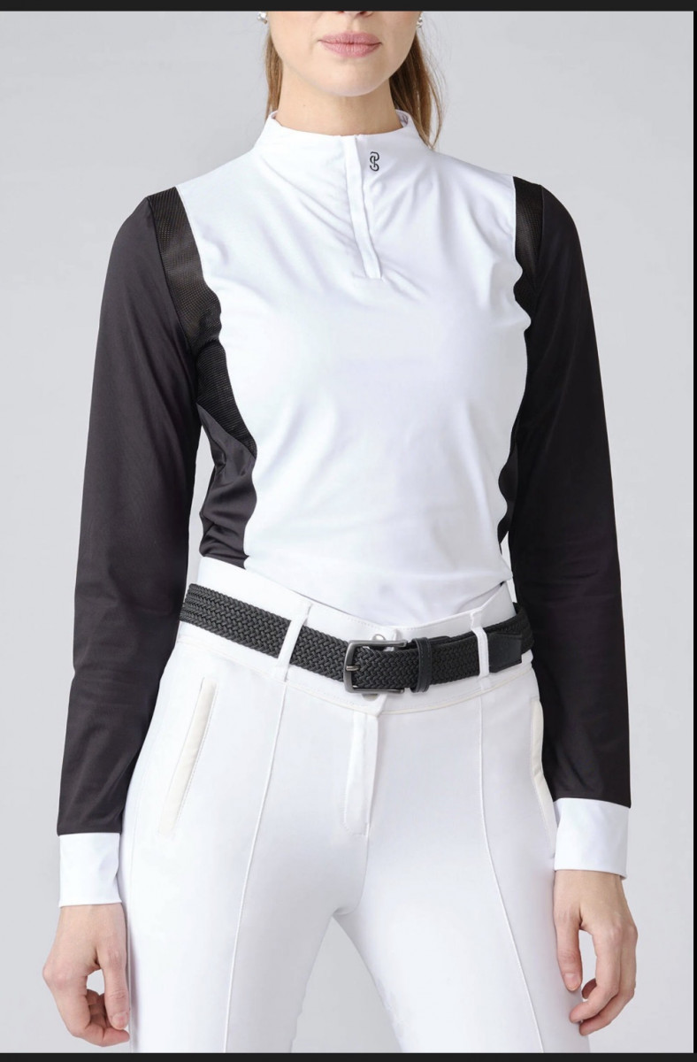 Long-sleeved competition top made of stretchy and silky material with mesh inserts around shoulders and armpit for superior breathability.