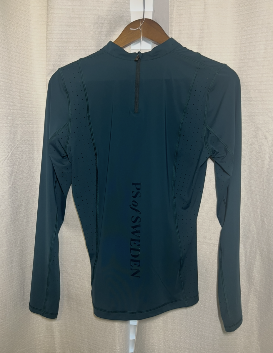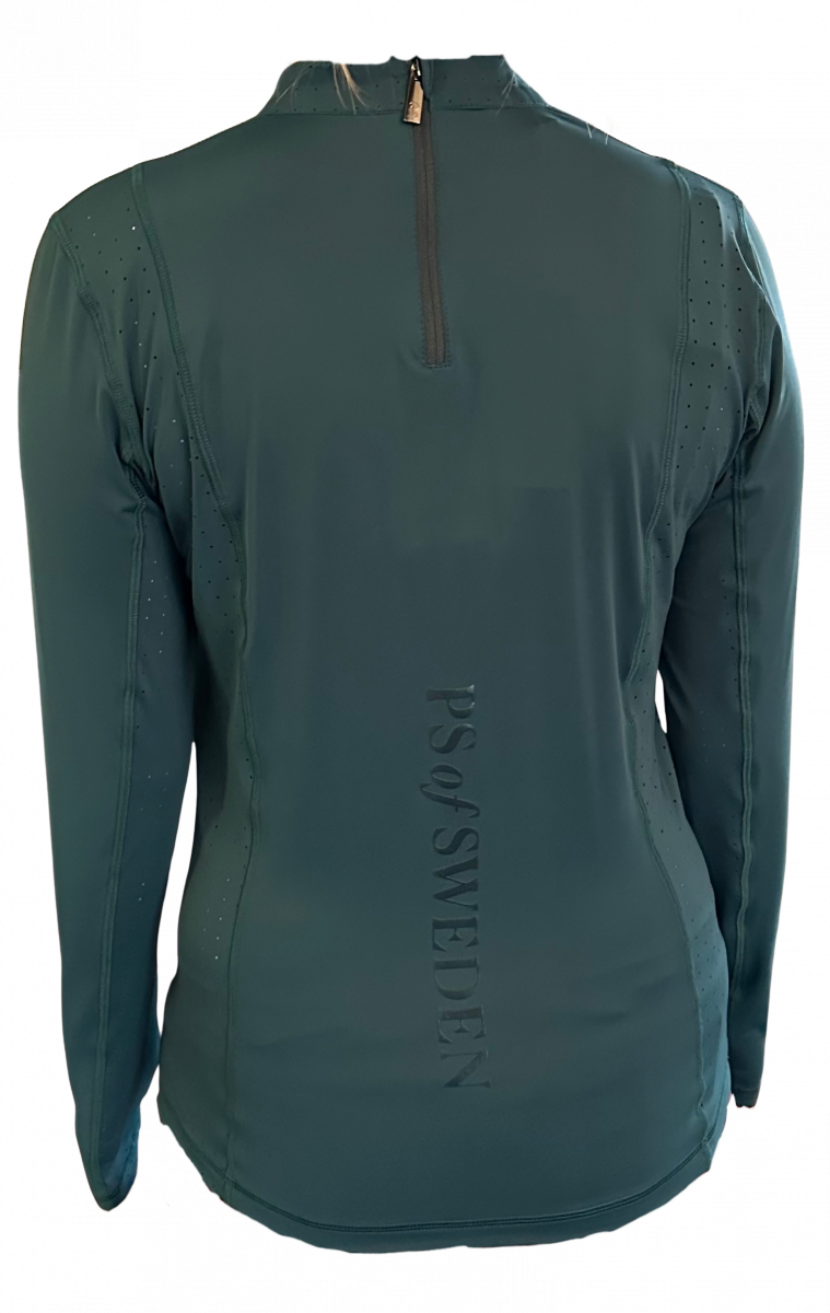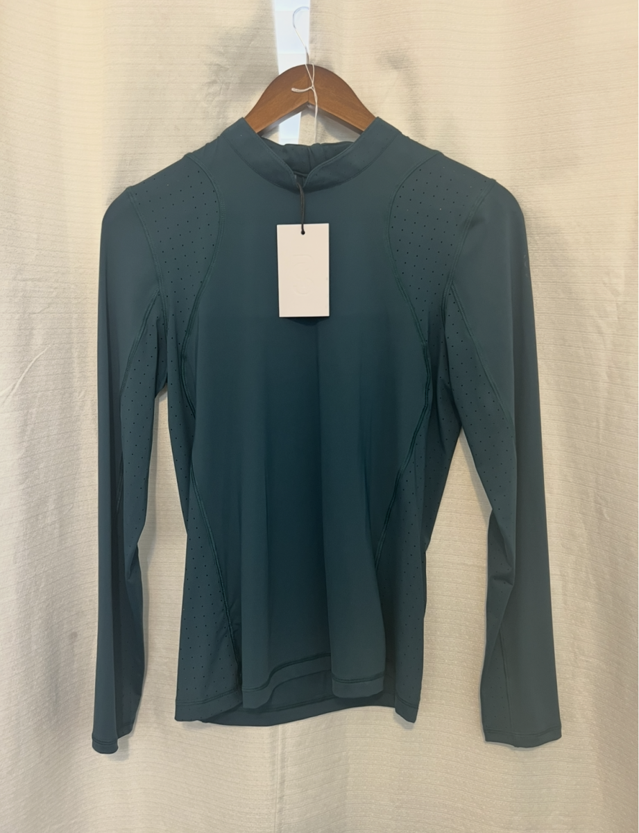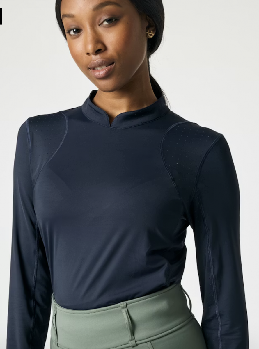 Introducing our long sleeve top, designed for comfort and breathability. This top features strategically placed breathable panels with laser cut holes to keep you cool and comfortable throughout the day. The mandarin collar with hook & eye fastening adds a touch of elegance and practicality, making it perfect for both riding and casual wear.