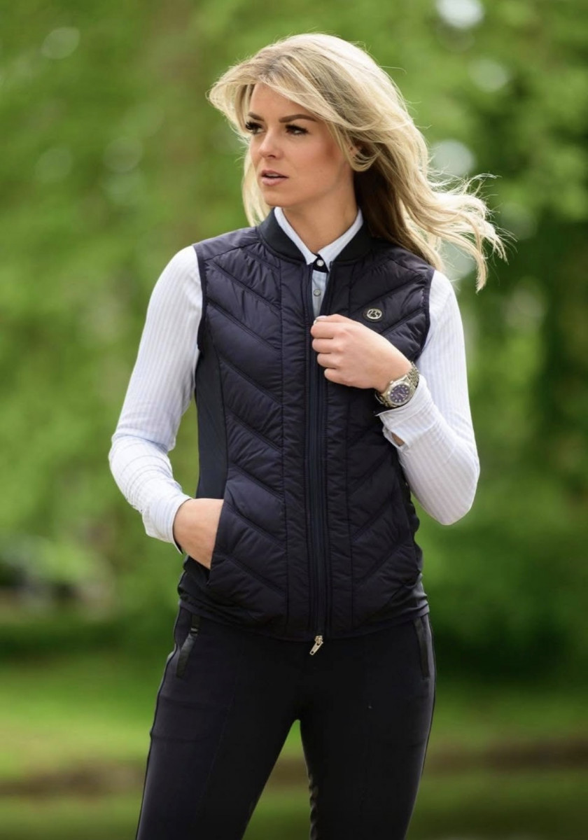 The perfect in-between-vest, over, underneath, and combined ! Sofia is the perfect vest when you need something great looking and slightly warming, for example over your show jacket, under your coat, or just on a cooler day. The vest has a V-shaped quilting to give a feminine silhouette. The lightweight filling gives a feather light, yet mildly warming feeling. Despite its light weight, is the vest both wind resistant and breathable, and it has an anti-static finish. The PS-zipper goes both ways and is also found along the hidden side pockets. The vest is very comfortable, stretchy and fits like a second skin. At the chest the vest is beautifully decorated with a silver colored PS-badge. All our clothes are down free and environmentally friendly. Sofia is available in the colors Chocolate and Deep Sapphire, both of which matches perfectly with both our riders collection and this seasons lovely set of saddle pads. Match yourself, your horse and the two of you together, for the absolute perfect look! Detailed information: 100% Polyester 100% Down and feather free Wash with similar colors in 30° C. Do not tumble dry. Fits true to size, take your normal size