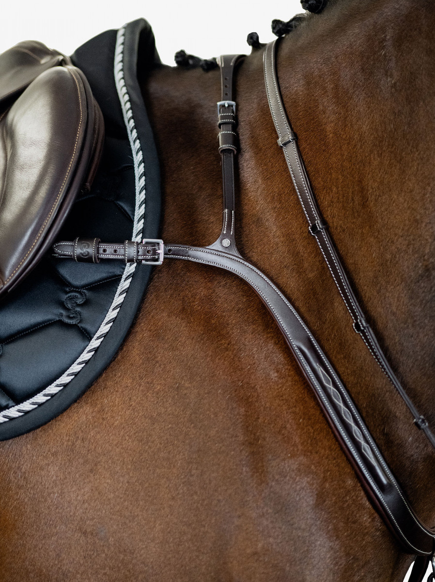 A luxurious and well-worked breastplate, extra wide and padded for additional comfort. Clip on rings for the reins.